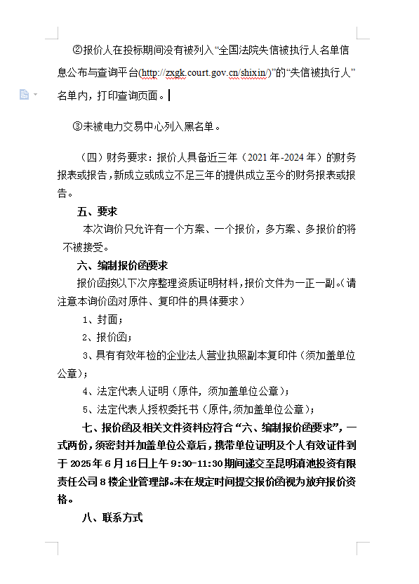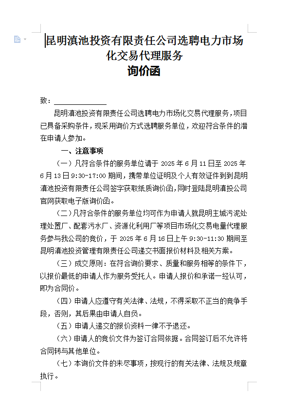 首頁>信息公開>昆明滇池投資有限責(zé)任公司選聘電力市場化交易代理服務(wù)詢價(jià)函