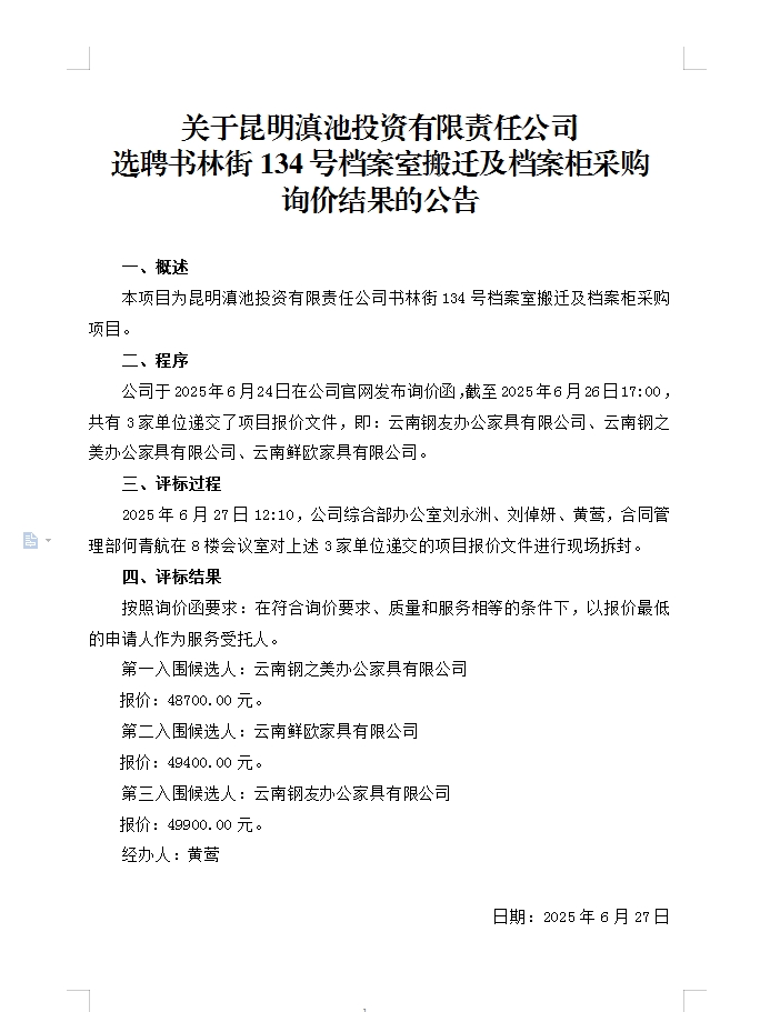 關(guān)于昆明滇池投資有限責(zé)任公司選聘書(shū)林街 134 號(hào)檔案室搬遷及檔案柜采購(gòu)詢價(jià)結(jié)果的公告