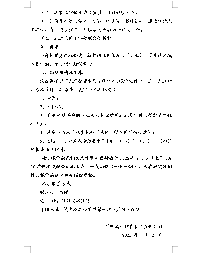 昆明滇池投資有限責(zé)任公司選聘滇池流域廠網(wǎng)河湖系統(tǒng)設(shè)施數(shù)據(jù)勘測及應(yīng)用研究項目審核單位詢價函