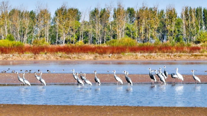 在山東黃河三角洲國家級自然保護區(qū)拍攝的白枕鶴(2022年10月18日攝)。