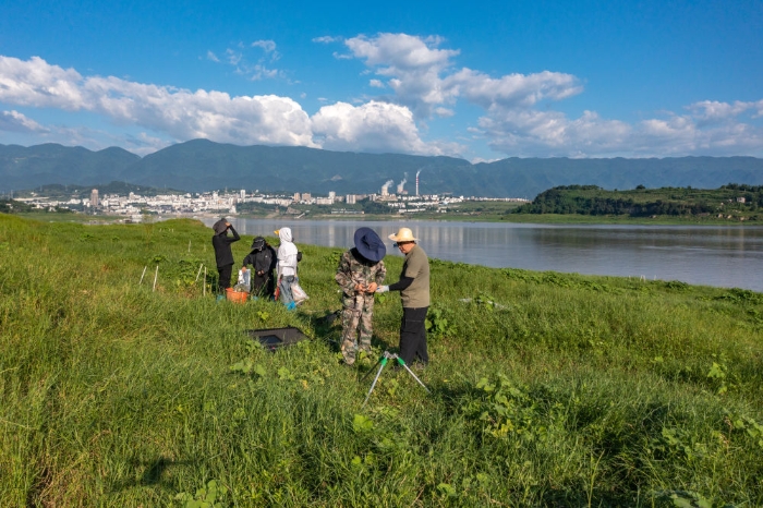 在位于重慶的中國科學院三峽庫區(qū)水土保持與環(huán)境研究站,中國科學院成都山地所科研人員在庫區(qū)消落帶上開展相關監(jiān)測(2023年7月5日攝,無人機照片)。新華社記者 黃偉 攝