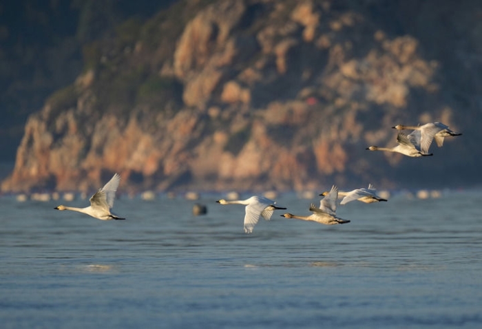 一群天鵝飛過閩江河口濕地上空(2023年1月31日攝)。新華社記者 魏培全 攝