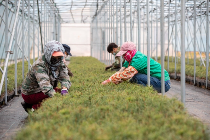 在黑龍江伊春森工集團紅松種苗繁育基地,工作人員在養(yǎng)護輕基質紅松苗(2023年5月20日攝)。新華社記者 張濤 攝