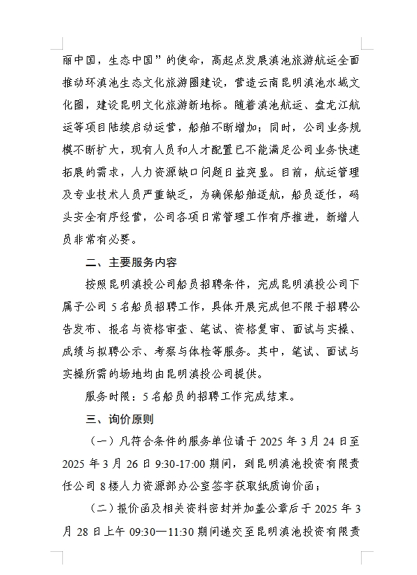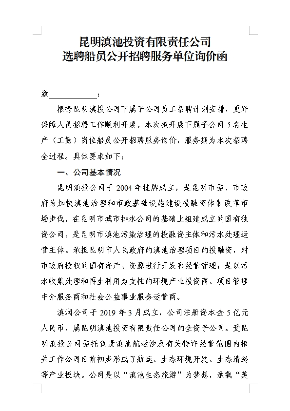昆明滇池投資有限責任公司選聘船員公開招聘服務(wù)單位詢價函