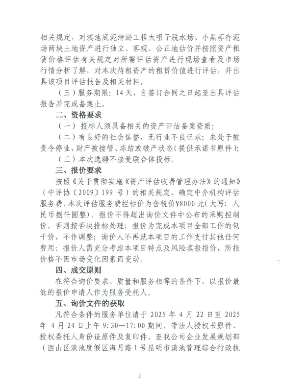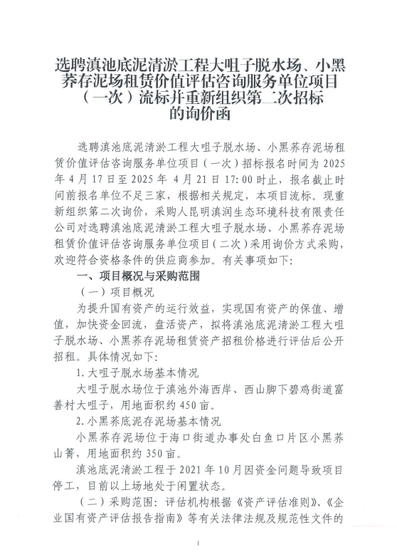 選聘滇池底泥清淤工程大咀子脫水場(chǎng)、小黑蕎存泥場(chǎng)租賃價(jià)值評(píng)估咨詢服務(wù)單位項(xiàng)目(一次)流標(biāo)并重新組織第一次招標(biāo)的詢價(jià)雨